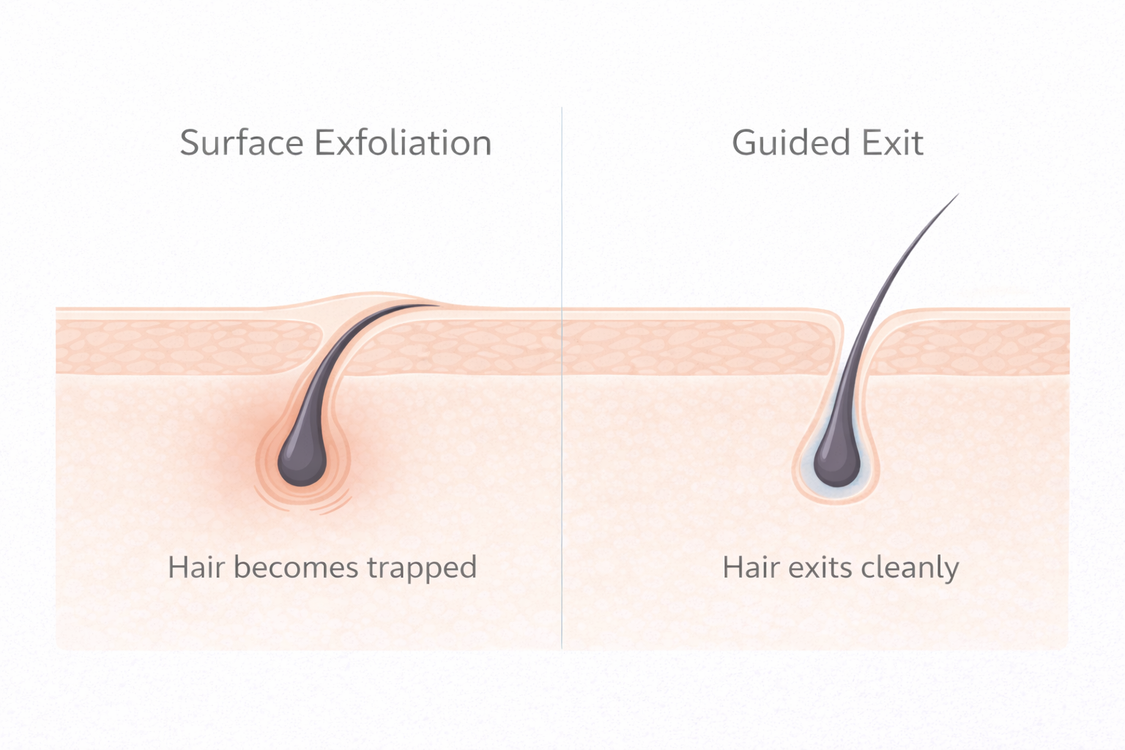Most treatments react after irritation begins. By then, the hair is already trapped. Exfoliation smooths — it doesn’t prevent blockage. Prevention starts before the hair gets stuck.